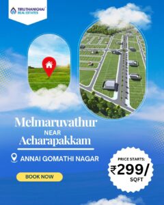 Located in the serene and developing area of Melmaruvathur, near the well-connected town of Acharapakkam, our plots at Annai Gomathi Nagar offer an ideal setting for your future home or investment.